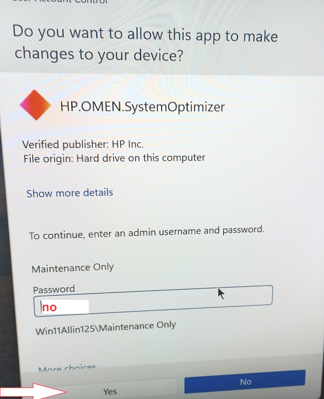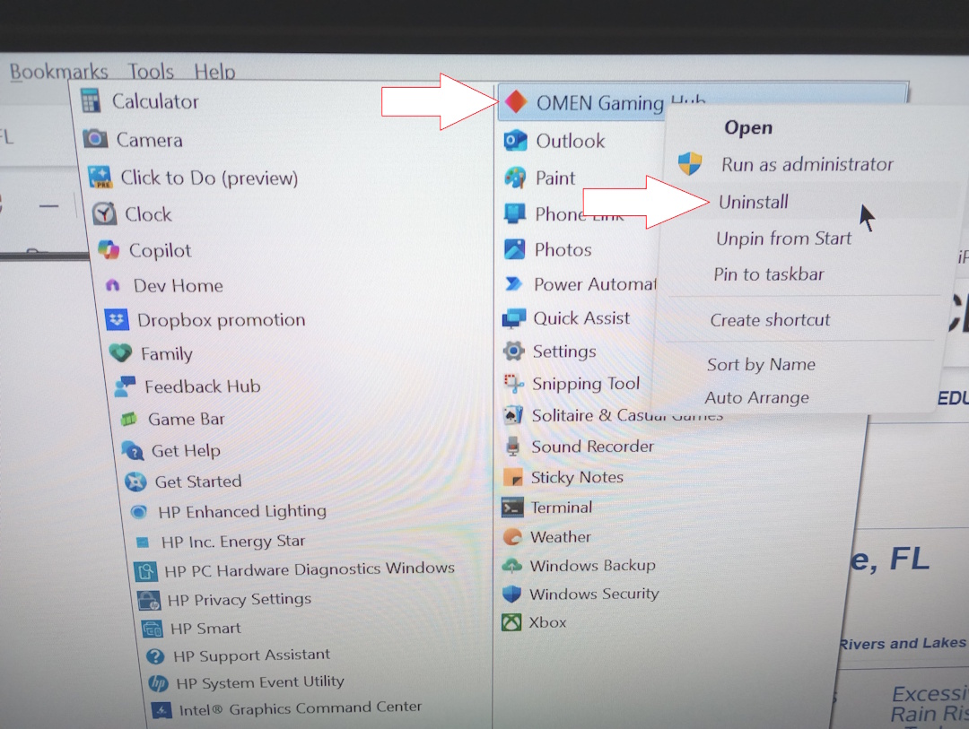 After you setup a new HP Windows computer this annoying pop up starts to occur. When I setup a new computer it is one of the first items I uninstall. But somehow HP is reinstalling the app after it is uninstalled. So if you get this pop up, click on the Apps list on the Start menu then right click on OMEN Gaming Hub then left click on Uninstall. Then the Maintenance window will pop up, type in no then click on the Yes button (see below).